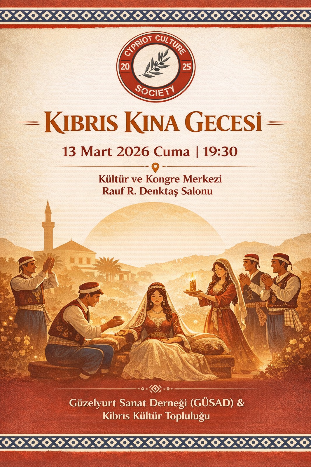 mARTfest Kültür ve Sanat Festivali kapsamında, Kıbrıs Kültür Topluluğu’nun Güzelyurt Sanat Derneği (GÜSAD) ile birlikte organize ettiği “Kıbrıs Kına Gecesi” etkinliği, 13 Mart 2026 Cuma (bugün), saat 19:30'da Kültür ve Kongre Merkezi, Rauf R. Denktaş Salonu’nda gerçekleşecektir.